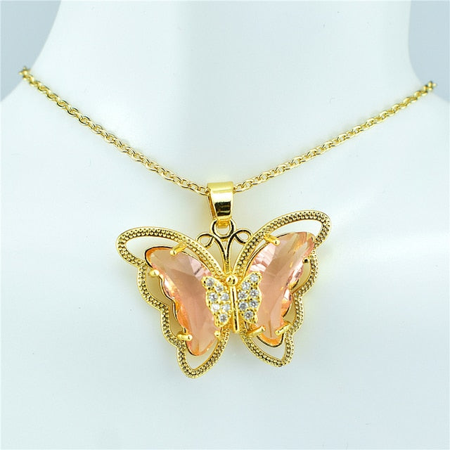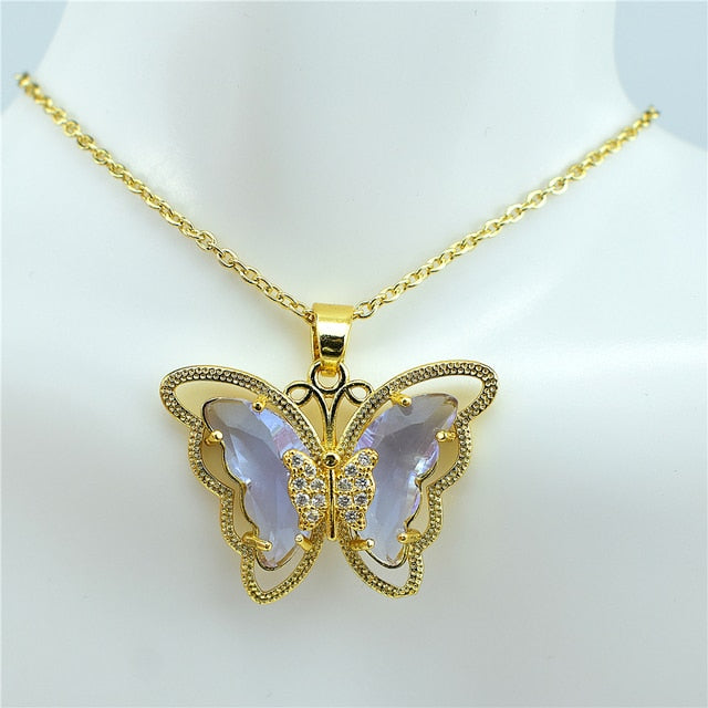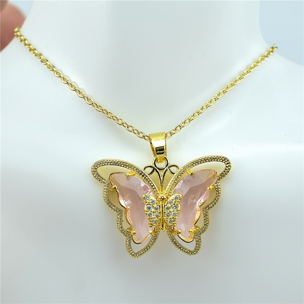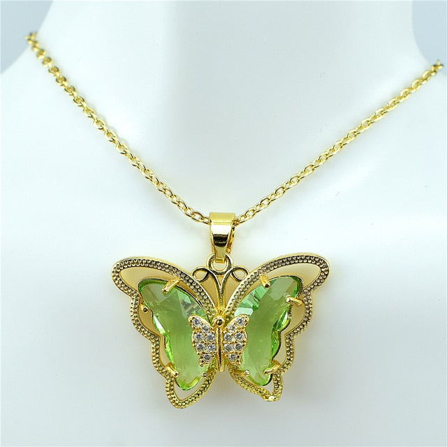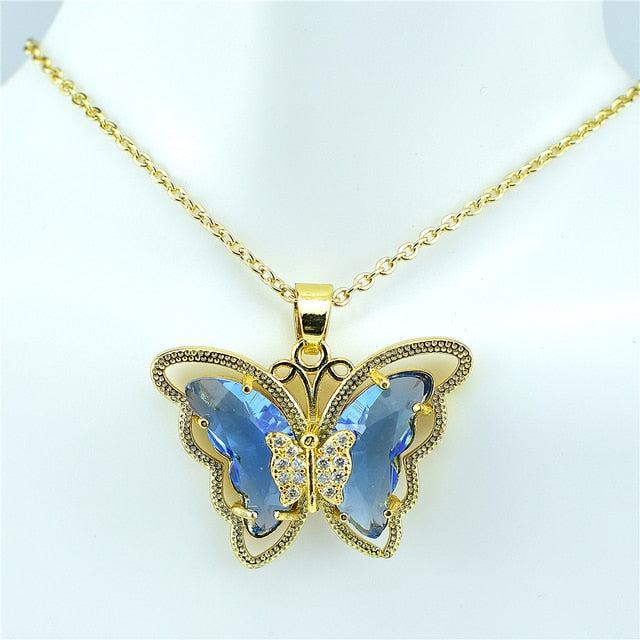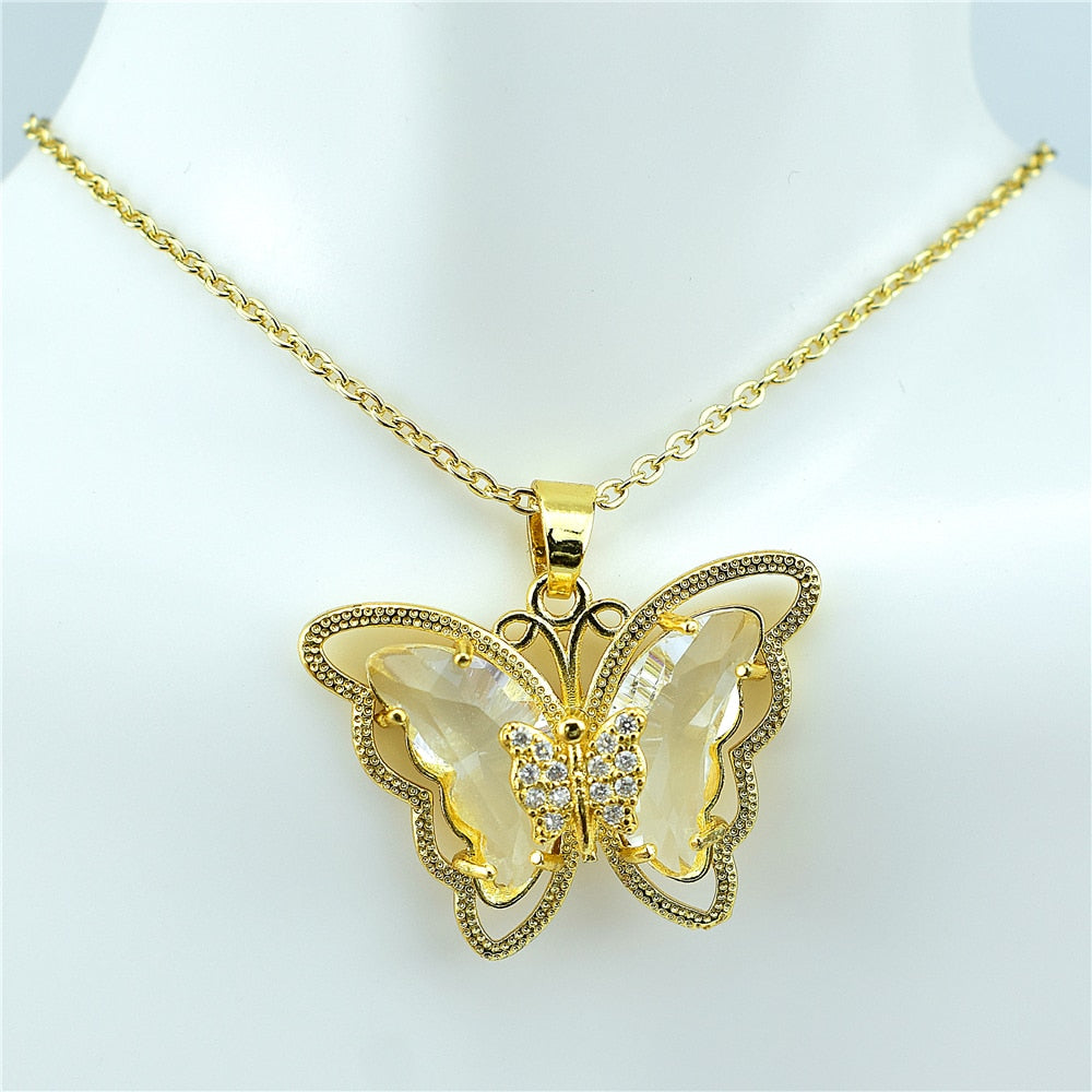 Give your look a delicate and stylish touch with our Crystal Glass Butterfly Necklace. Handcrafted from crystal glass, this necklace features a unique butterfly pendant with sparkling details that will elevate any outfit. The graceful curves of the O-word chain form an elegant silhouette that can be worn day or night. Easily dress up a casual look or give office attire an added touch of glamour. Whether you want to make a statement in a special occasion or add something special to an everyday look, this necklace comfortably pairs with everything. Get ready for compliments wherever you go! Our Crystal Glass Butterfly Necklace is sure to be the timeless accessory your wardrobe needs.