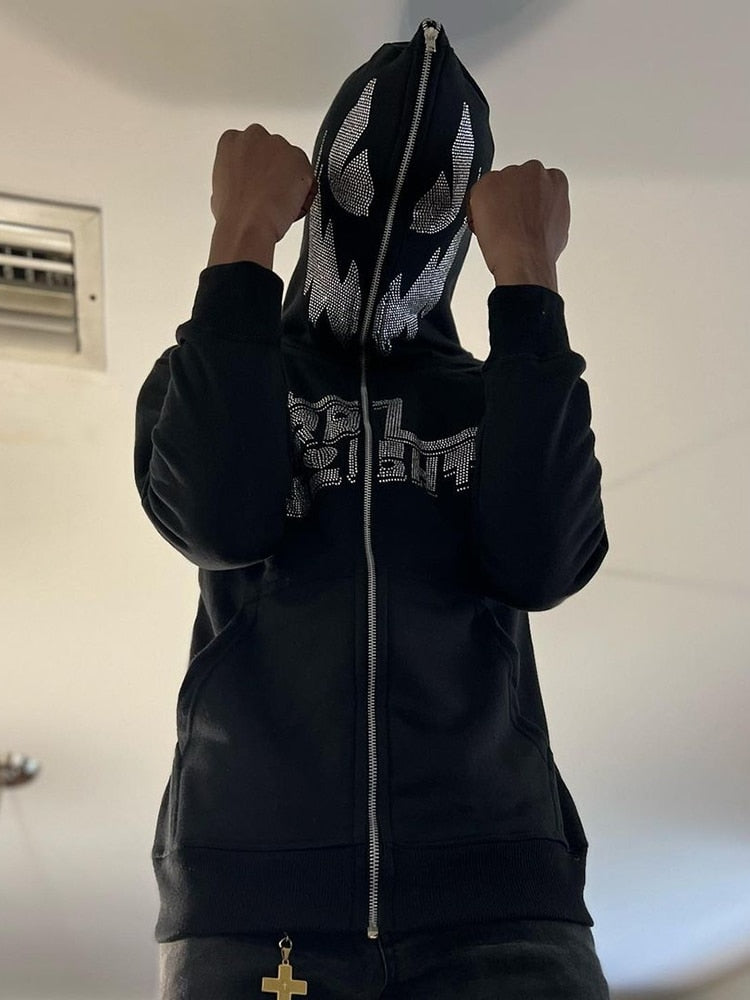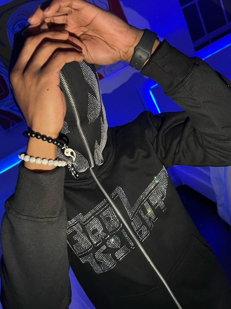 It is time to stand out from the crowd in style with one of our Rhinestone Skeleton Hoodies! This fashionable hoodie is the perfect combination of streetwear and glamour. The black exterior has the classic hoodie look, while the crystal embellishment creates a unique edge that will turn heads wherever you go! Not only is it stylish, it is also highly comfortable and sure to keep you warm through all seasons. The zip up feature allows for adjustable coverage when needed; and the fabric blend makes this hoodie breathable and soft to the touch. Let your true sense of fashion shine with this statement piece. It's a must have item - trust us! Get yours today and carry your own skeleton key to style happiness.