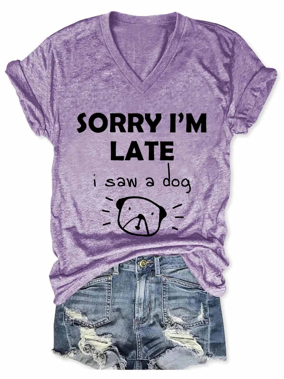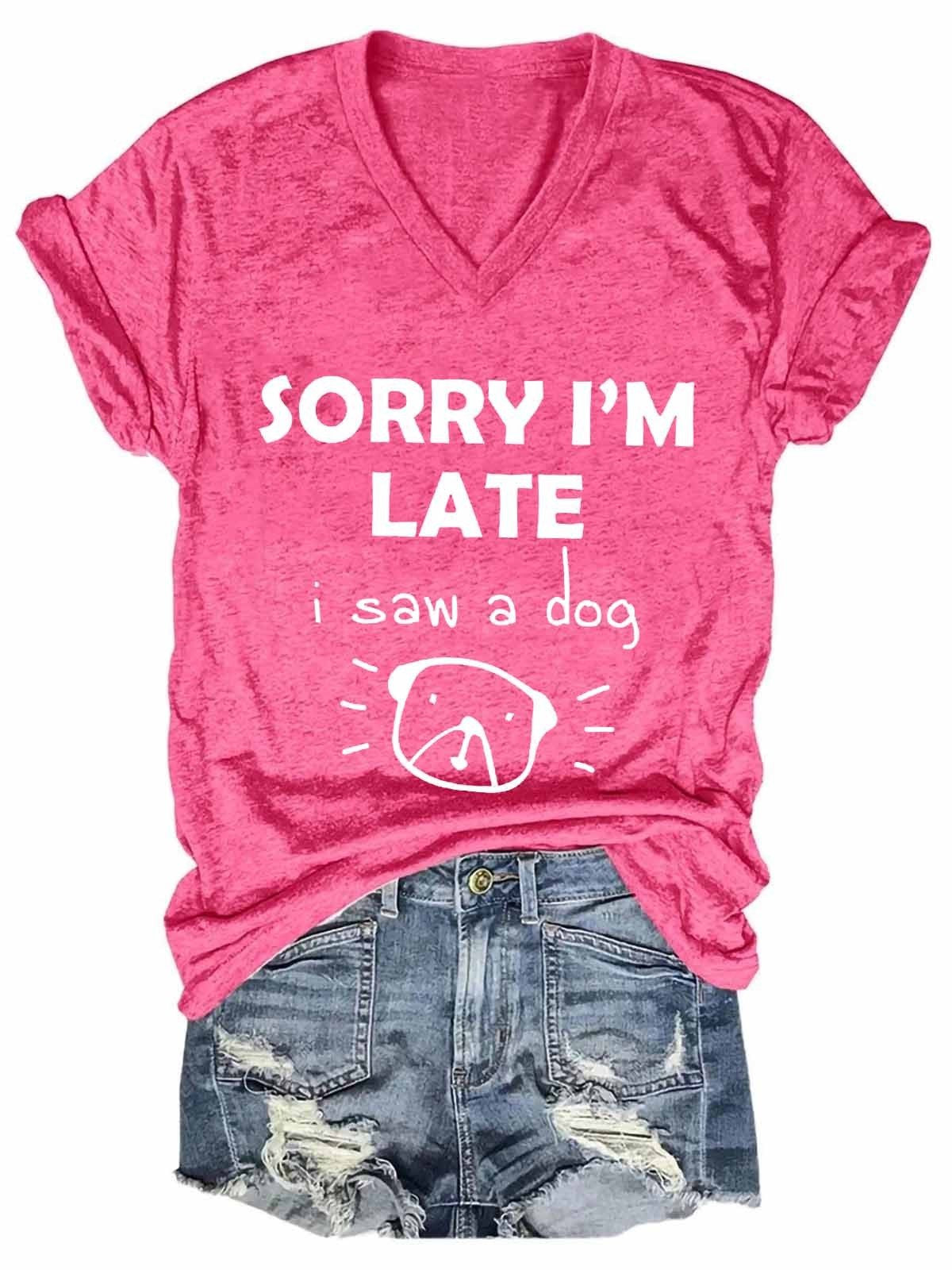 Introduce yourself to the Women's Dog Statement V-Neck Tee from our collection! This fashionable and stylish garment is sure to be your new go-to for any occasion. Featuring the iconic phrase 'Sorry I'm Late I Saw a Dog', this V-neck tee leaves no doubt that you are a certified animal lover. The unique and quirky design is crafted on a lightweight material, pairing utility with immense comfort. Its contemporary cut is sure to flatter all body types alike, and maybe even bring out your inner animal instinct. Paired with pants, skirts, shorts, and almost anything else you can imagine, this versatile item will always fit perfectly into your wardrobe. Don't miss out on getting one of these statement t-shirts for yourself today - everyone loves a good dog pun!